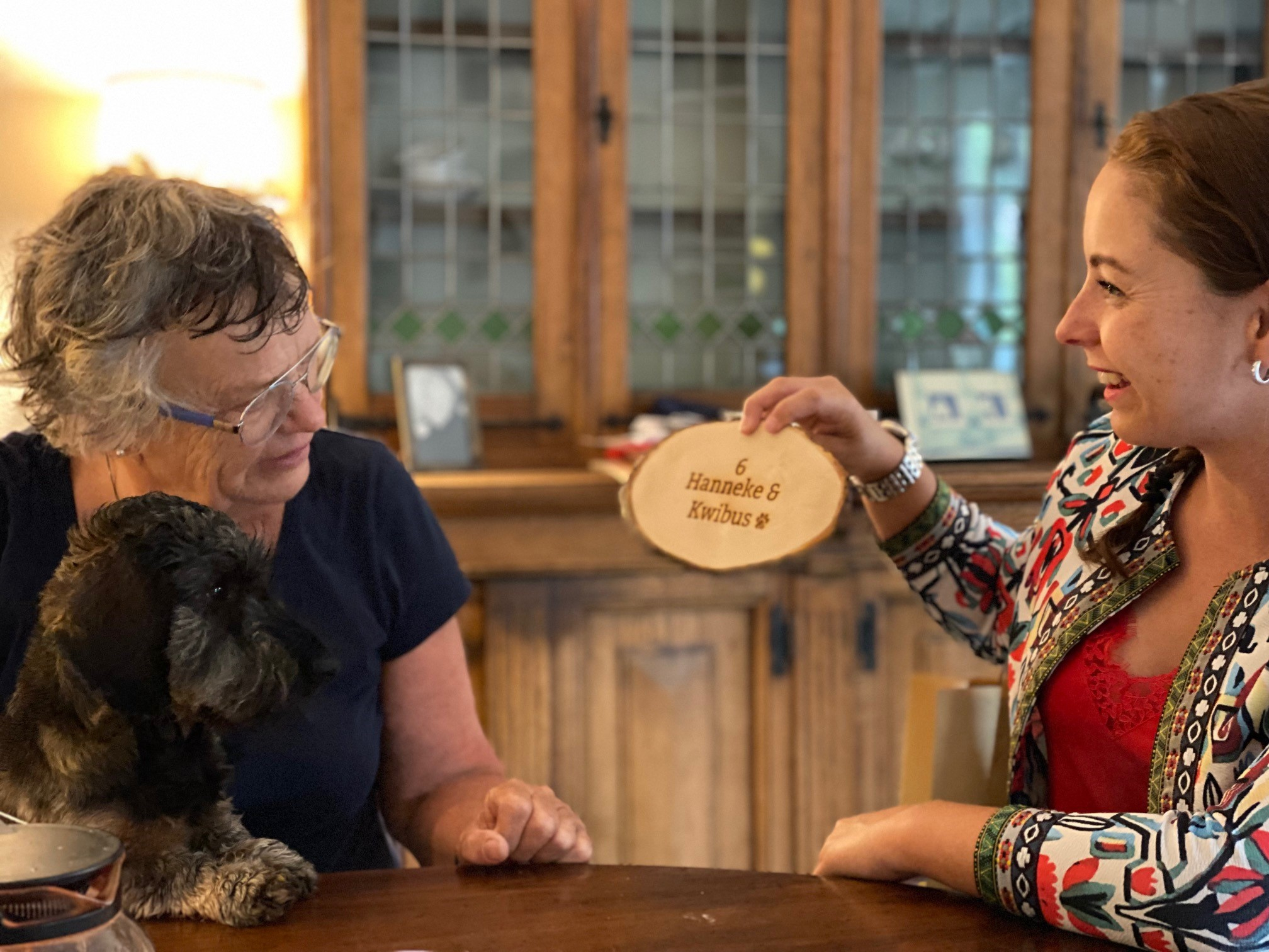 Inmiddels woont Hanneke zo'n twee maanden op haar nieuwe stek. Om dat te vieren, heeft Fiona een cadeautje voor haar: een naambordje voor bij de voordeur. "Ik vind het bijzonder dat Hanneke zo snel haar draai heeft gevonden hier", verklaart ze. "Ze heeft zich aangemeld als fietsmaatje en trekt er regelmatig op de duofiets op uit met een medebewoner van 93. Ze heeft direct een leuk contact met haar buren opgebouwd en heeft het tuinieren ontdekt. Als Hanneke iemand om hulp vraagt, krijgt ze er meteen een vriend bij – zo vrolijk en vriendelijk is ze. Dat vind ik geweldig. Ik ben blij dat ik haar heb kunnen helpen."