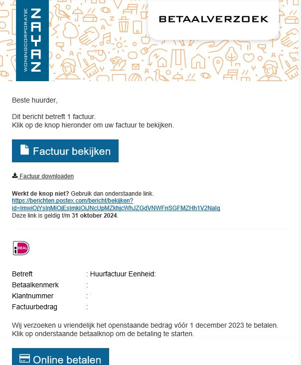 U krijgt nog steeds een link om de huur met iDEAL te betalen. En u krijgt de factuur van de huur als bijlage meegestuurd. Zo ziet u waar u naast uw kale huur voor betaalt. Bijvoorbeeld voor het glas- of rioolfonds of voor de voorschotten van de servicekosten.