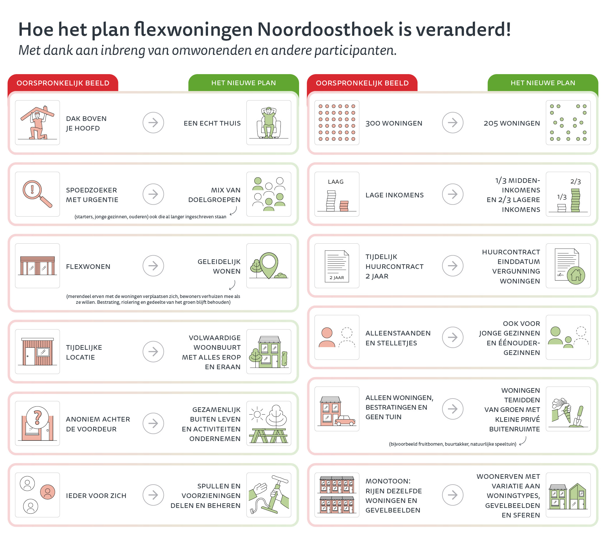 We hebben verschillende gesprekken gevoerd met omwonenden en geïnteresseerden. Dat leverde ons veel waardevolle reacties op. Deze hebben we ook meegenomen. In de afbeelding hieronder kun je zien wat we in de loop van de tijd aanpasten om tot het stedenbouwkundig plan te komen. Een uitwerking van de gewenste inrichting van deze nieuwe woonbuurt met haar woonerven, het groen en de parkeerplaatsen.