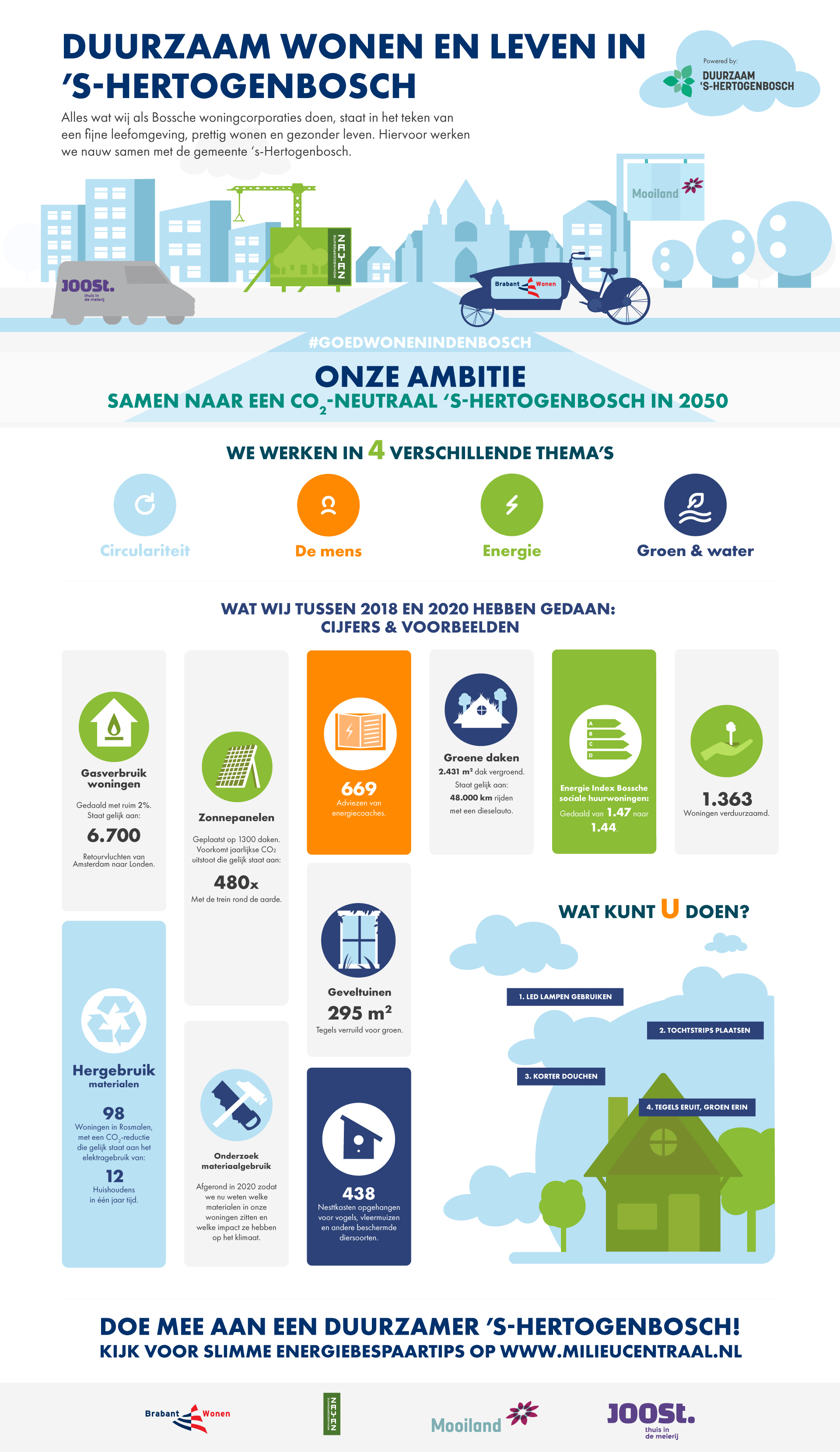 Benieuwd waar we als Bossche woningcorporaties staan met onze ambities op het gebied van een duurzaam 's-Hertogenbosch? Bekijk de infographic hieronder. Hierin ziet u waar we voor gaan, wat we doen, en het effect van onze inzet.